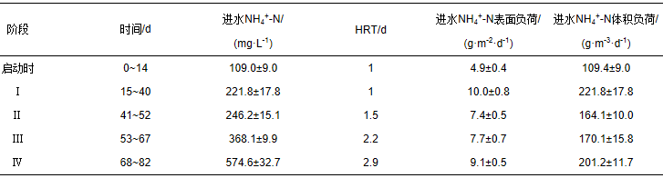 試驗過程采用溫控裝置保證水溫在25~30 ℃,添加碳酸氫鈉調節堿度,控制pH在7.5~8.3之間,供氧通過膜氧分壓控制,穩定運行階段,逐步提高進水氨氮濃度,同時調控HRT,控制反應器進水氨氮負荷.
