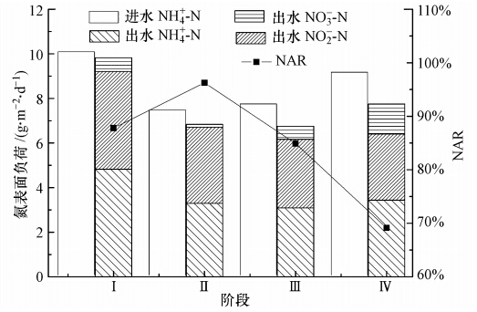 由于中試裝置膜組件設立膜絲數量較少,膜比表面積相對較小,后續研究中已證實成倍增加膜組件膜絲數量時,生物膜對污染物表面去除負荷相近,容積去除負荷成倍增加,因此,本研究中氨氮去除負荷采用生物膜表面去除負荷來表征,列出的容積負荷僅供參考.
