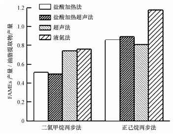 一步法每克干泥所得FAMEs質量如圖 3所示,一步法中超聲法產量最高,FAMEs產量為(45.5±3.2)mg · g-1,普通法其次,FAMEs產量為(40.7±0.7)mg · g-1,鹽酸法和鹽酸超聲法產量較低,分別為(29.8±4.3)mg · g-1和(33.4±2.6)mg · g-1,液氮法最低,產量為(27.2±4.2)mg · g-1.在一步法中,硫酸是關鍵的因素,它不但是酯化反應的催化劑,而且可以將一些脂肪酸鹽轉化為脂肪酸參與酯化反應,同時硫酸有很好的破壞細胞壁效果,本實驗中用到的體積比為5%的硫酸-甲醇在同類實驗中屬于較高的濃度,可兼顧破壁和甲酯化反應,因此,普通法也可以得到比較高的脂肪酸甲酯產量.Pastore等(2013)的研究表明,在甲酯化反應中,在一定范圍內硫酸的濃度越高,得到的脂肪酸甲酯的量也就越大.實驗結果表明,超聲法有助于提高產量,而鹽酸法和鹽酸超聲法反而降低了脂肪酸甲酯的產量.這很可能是因為酯化反應為可逆反應,鹽酸含有較多的水,促使甲酯化反應向相反方向移動,即水會和甘油酯或脂肪酸甲酯反應生成游離脂肪酸,降低脂肪酸甲酯產率.因此,盡管鹽酸法和鹽酸超聲法有比較強的破壁效果,但并不適用于一步法.
