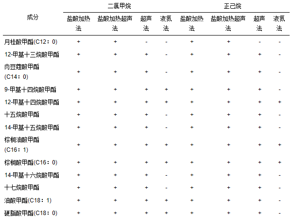 一步法脂肪酸甲酯產物組成如表 4所示,幾種破壁方法的甲酯化產物組成基本一致,同樣出現了上述5種含有甲基支鏈的脂肪酸甲酯及2種單不飽和脂肪酸甲酯.但在沒有破壁處理的酯化反應后,沒有檢測到12-甲基十三烷酸甲酯,而采用鹽酸加熱超聲法和液氮法破壁后,則無法檢測到硬脂酸甲酯(C18 ∶ 0).總體而言,在成分上與采用鹽酸加熱或鹽酸加熱超聲破壁的兩步法基本一致.