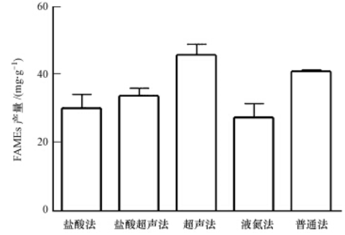 1)制備生物柴油兩步法中采用鹽酸加熱破壁的效果最好,而制備生物柴油一步法則是采用超聲破壁的產(chǎn)量最高.