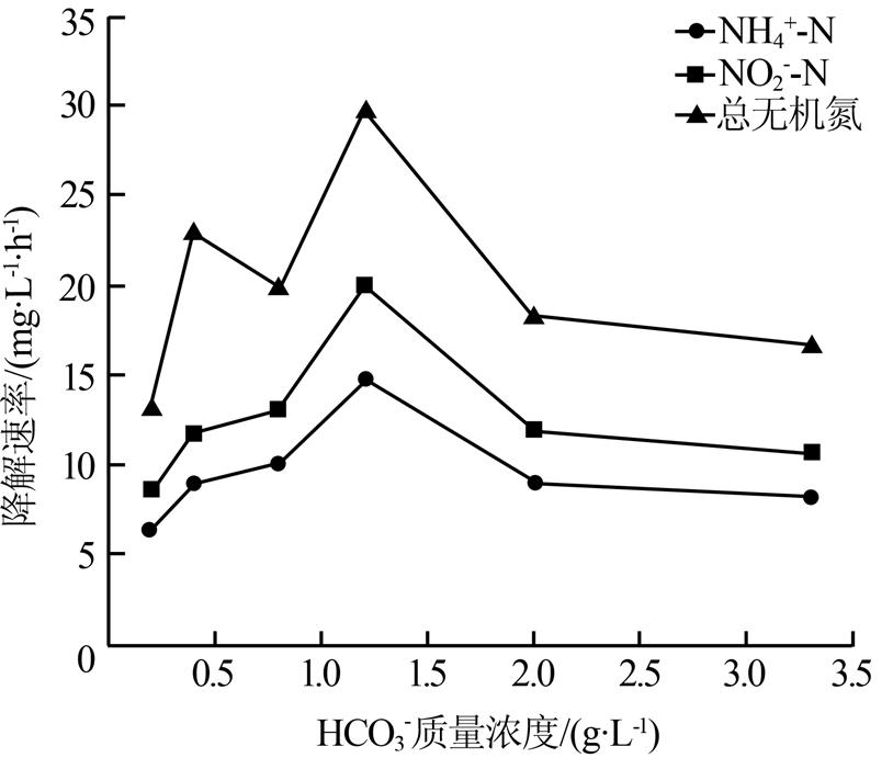 在反應(yīng)時(shí)間為6 h的條件下,考察了NH4+-N、NO2--N和總無(wú)機(jī)氮降解速率隨進(jìn)水HCO3-濃度的變化,結(jié)果如圖 3所示。