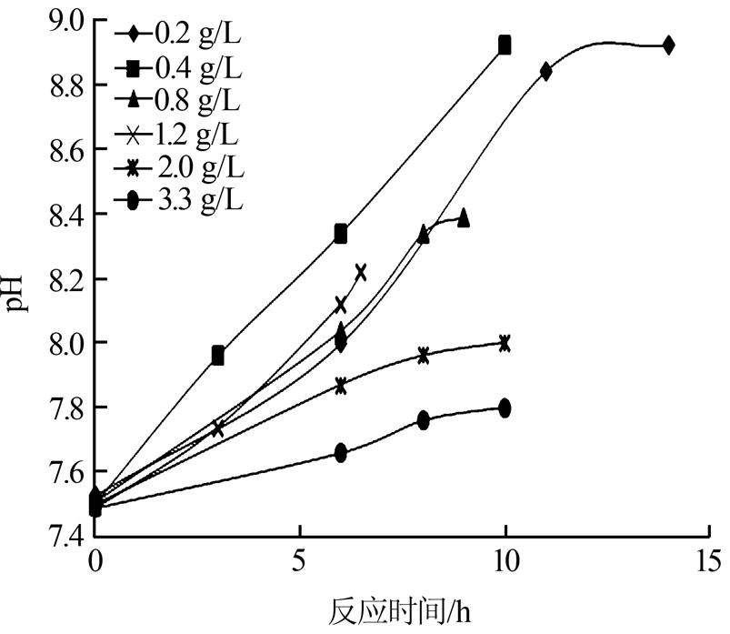 厭氧氨氧化過程中H+不斷被消耗,致使系統(tǒng)pH不斷升高。研究結(jié)果表明,厭氧氨氧化菌的最適pH為6.7~8.3,而氮負(fù)荷高且去除率高時(shí)會(huì)造成系統(tǒng)內(nèi)部pH高于厭氧氨氧化菌的最適pH范圍,導(dǎo)致厭氧氨氧化菌的活性大幅降低。由圖 3可知,當(dāng)進(jìn)水HCO3-質(zhì)量濃度<0.8 g/L時(shí),即使原水pH調(diào)控至7.5±0.1左右,反應(yīng)到中期以后反應(yīng)器內(nèi)的pH仍升至8.5以上,且之后上升幅度更大,不適于厭氧氨氧化菌的生長(zhǎng);當(dāng)進(jìn)水HCO3-質(zhì)量濃度>0.8 g/L時(shí),整個(gè)反應(yīng)過程中反應(yīng)器內(nèi)的pH基本可以穩(wěn)定在ANAMMOX反應(yīng)所需要的最佳pH范圍,且整個(gè)反應(yīng)過程中pH變化幅度相對(duì)較小,可為厭氧氨氧化菌的生長(zhǎng)提供良好的pH環(huán)境,有利于ANAMMOX反應(yīng)的順利進(jìn)行。實(shí)驗(yàn)結(jié)果表明,原水中高濃度的無(wú)機(jī)碳可作為pH的緩沖劑。綜合考慮,最佳進(jìn)水HCO3-質(zhì)量濃度為1.2 g/L。
