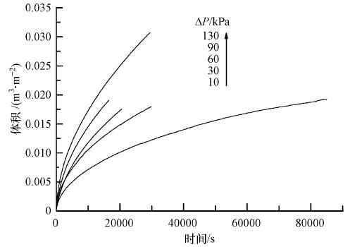 天然水體中普遍存在Ca2+,其與水中多糖結(jié)合后通常能被超濾膜截留,是造成膜污染的重要因素.圖 2表示海藻酸鈣溶液在不同壓力下恒壓過濾的V-t關(guān)系.