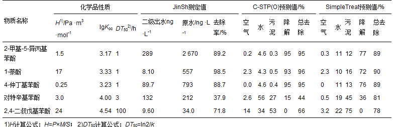 對特辛基苯酚實測值、 C-STP(O)預測值、 SimpleTreat預測值分別為37.9%、 44%、 81%,相比SimpleTreat模型,C-STP(O)預測結果差異較大. 一方面,是因為C-STP(O)在吸附性參數上更符合中國實際情況,另一方面,對特辛基苯酚28 d生物降解率>60%,10 d觀察期降解率<60%,SimpleTreat模型k=0.3 s-1,而C-STP(O)模型采用的k=0.23 s-1,說明C-STP(O)的k取值為標準也較為合理.