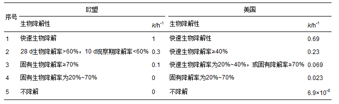 表 4 歐盟和美國生物降解性篩選試驗結果外推STP中降解速率常數的標準 [34]