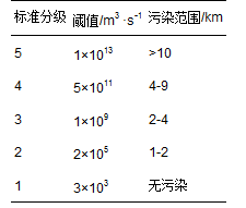 式中,Pk:目標(biāo)層k等級(jí)惡臭污染潛力值; pik:i指標(biāo)k等級(jí)的惡臭污染潛力. 計(jì)算出的污染潛力等級(jí)閾值,根據(jù)某一污染源的惡臭物質(zhì)的惡臭污染潛力值即可判斷其惡臭污染潛力等級(jí),根據(jù)臭氣排放強(qiáng)度可知道相應(yīng)的污染影響范圍(表 4).