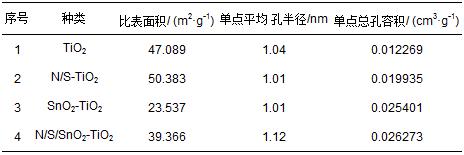 在上述水熱反應前的溶液中緩慢加入定量的氯化錫醇水溶液,攪拌30 min.控制水熱反應溫度為180 ℃,反應4 h,離心、洗滌、干燥后煅燒3 h,得到N/S/SnO2-TiO2產品.