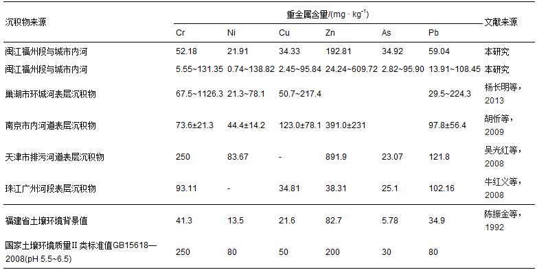 表1 研究區(閩江福州段與城市內河)與中國其它地區表層沉積物重金屬含量對比