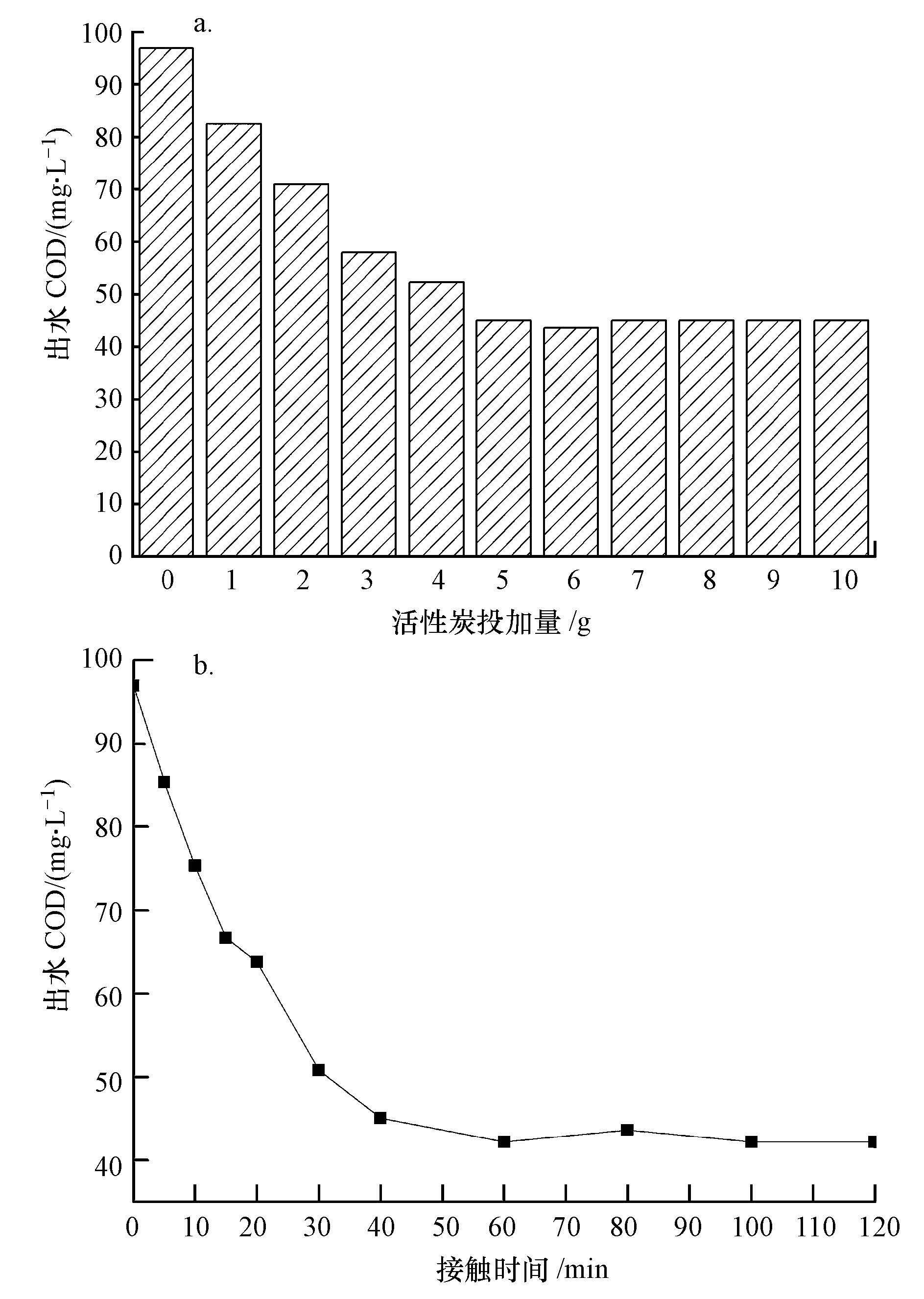 圖1 活性炭投加量(a)和接觸時間(b)對出水COD的去除影響