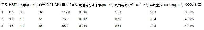動態吸附試驗操作方法見2.2.3節,對HRT=0.5、1.0、1.5 h 3個工況的出水進行測定,各工況下出水COD的變化規律見圖 3,其中,0時刻數值為原水中的COD.由圖 3可知,水力停留時間(HRT)為1.0和1.5 h時,活性炭動態吸附后出水COD都可降 至38 mg · L-1左右,達到提標后50 mg · L-1的排放標準.而HRT為30 min時,出水COD為53 mg · L-1,未達到提標后的排放標準.在各工況下,出水COD平穩時為有效運行時間.根據各工況的運行結果,計算得出各工況的水利負荷、吸附帶的移動速度、出水COD平均值和COD去除率等參數,結果見表 3.