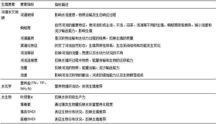 表1 水生態系統生境要素指標描述
