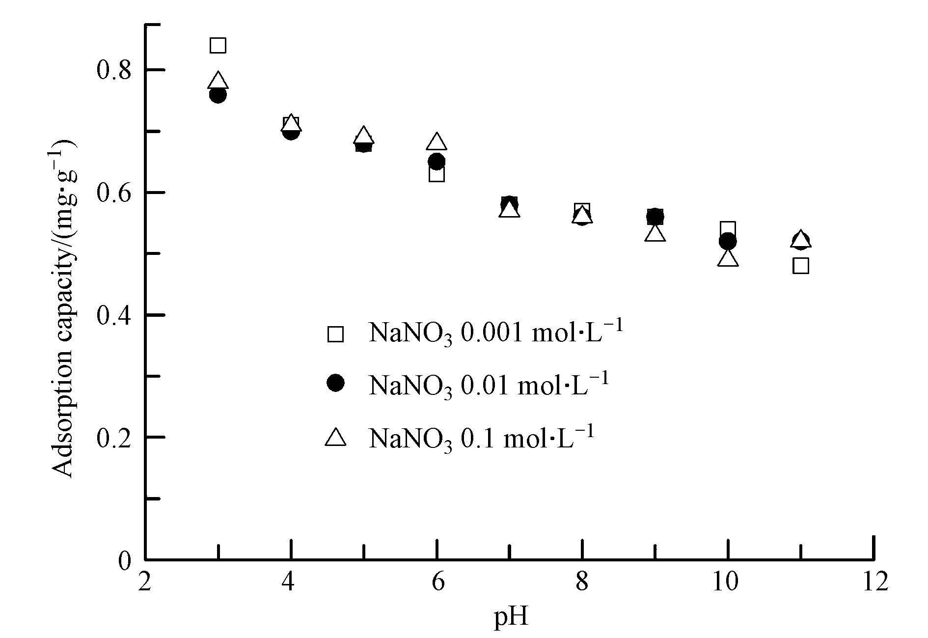 配制一系列50 mL濃度為5.0 mg · L-1磷溶液,分別投加200 mg吸附劑,考察不同pH(3.0~11.0)和不同離子強度(0.1 mol · L-1,0.01 mol · L-1,0.001 mol · L-1 NaNO3)對吸附磷的影響. 用HNO3和NaOH調(diào)節(jié)溶液pH,使pH穩(wěn)定在不同預(yù)定值.