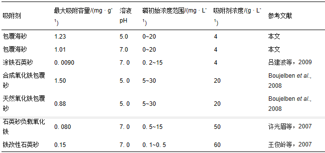 基于Freundlich吸附模型的假定條件推斷,包覆海砂對磷的吸附為多分子層吸附,最大吸附容量為1.01 mg · g-1(pH 7.0)與1.23 mg · g-1(pH 5.0),比包覆前海砂的磷最大吸附容量0.07 mg · g-1(pH 5.0)提高了13~17倍. 根據(jù)包覆海砂中鐵錳復(fù)合氧化物的含量為2.5%,計算包覆海砂的鐵錳復(fù)合氧化物的磷最大吸附容量為37.6 mg · g-1(pH 7.0)與46.4 mg · g-1(pH 5.0),顯著高于前期研究中粉末狀鐵錳復(fù)合氧化物的磷最大吸附容量36 mg · g-1(pH 5.6)(Zhang et al., 2009),表明鐵錳復(fù)合氧化物包覆海砂不僅能實現(xiàn)鐵錳復(fù)合氧化物的固定化,易于填充在吸附柱或吸附罐內(nèi)用于污水除磷,而且能充分發(fā)揮粉末狀鐵錳復(fù)合氧化物的磷吸附性能. 此外,與文獻中報道的負載改性砂顆粒吸附劑相比(見表 3),鐵錳復(fù)合氧化物包覆海砂具有較強的磷吸附優(yōu)勢.