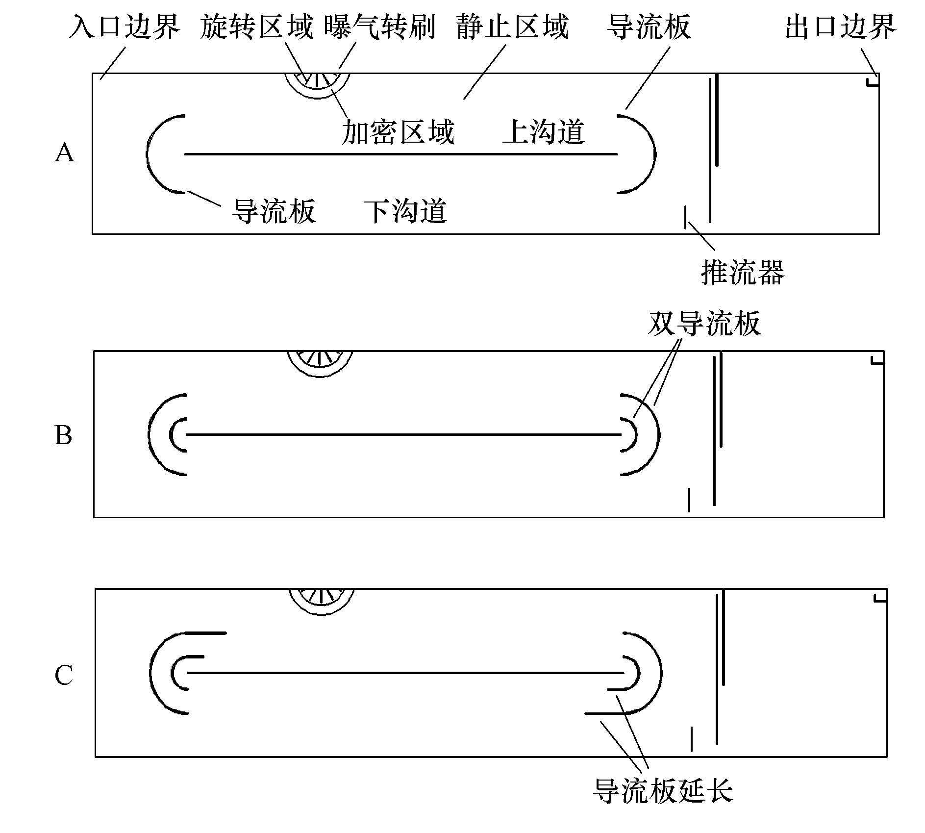 由前期研究可知,加裝導流板可以提高IODVC溝道內(nèi)混合液整體流速,改善下溝道靠近隔板處混合液的流態(tài)分布,但有關(guān)導流板的結(jié)構(gòu)形式對IODVC流場的影響尚缺乏深入的研究.為此,本文利用CFD理論與技術(shù),借助Fluent軟件平臺對IODVC進行二維流場模擬,探究加裝雙導流板及延長導流板末端長度對IODVC內(nèi)部流場的影響.