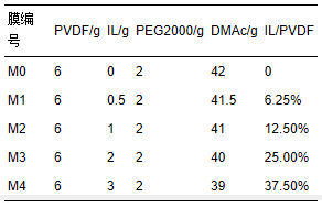 將適量離子液體(IL)溶解在DMAc中,并加入適量的引發(fā)劑AIBN,在65 ℃油浴中預(yù)聚合1 h,然后將其加入已溶解在DMAc中的PVDF和致孔劑(PEG2000)的混合液中,攪拌均勻后,將其放在70 ℃油浴中靜止反應(yīng)24 h.然后,在室溫下用玻璃刮刀在PP平板膜上(預(yù)先浸潤過50%乙醇溶液且晾干后)刮出一定厚度的初生液膜,刮刀厚度為150 μm,液膜在空氣中靜置約40 s后,浸入30 ℃濃度為10%的DMAc/水的混合溶液中凝膠成膜,然后將膜放入去離子水中浸泡至少24 h,備用.制膜過程中各物質(zhì)的配比如表 1所示.