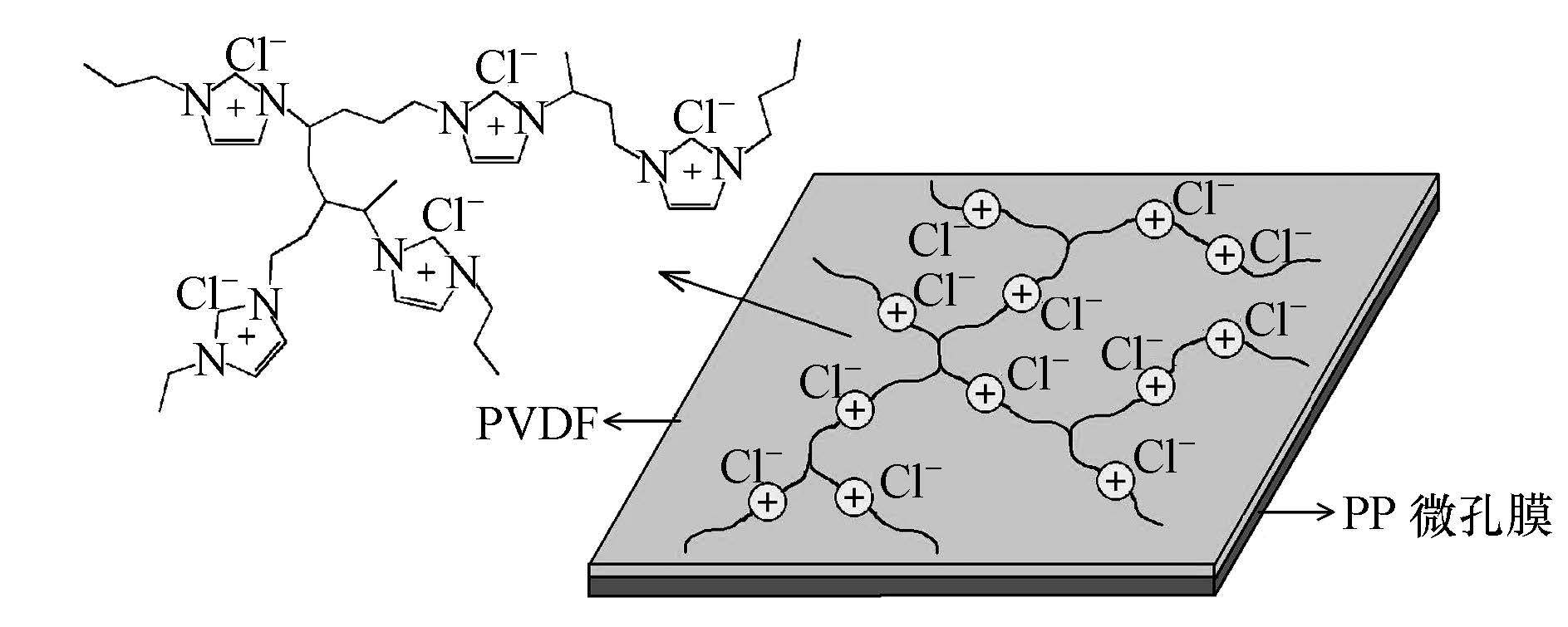 復(fù)合膜表面結(jié)構(gòu)示意圖如圖 1所示,聚離子液體共聚物分子鏈結(jié)構(gòu)呈網(wǎng)格狀分布,與PVDF分子相互交織,在PP微孔膜上形成PILs/PVDF功能分離層.聚離子液體單元結(jié)構(gòu)中由于含有荷正電的咪唑基團(tuán),使PP復(fù)合膜表面覆蓋荷正電層.