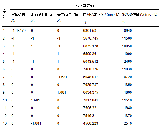 根據(jù)CCD(Central Composite Designs)中心組合試驗設(shè)計原理,在前期單因素試驗的基礎(chǔ)上,選擇水解溫度、水解酸化時間和蛋白酶投加量作為自變量,分別用X1、X2、X3表示,以總VFA濃度和SCOD濃度作為響應(yīng)值,分別用Y1、Y2表示,進行響應(yīng)面試驗因素水平安排,具體見表 1.由Design Expert 8.0.6(Stat-Ease),采用CCD試驗設(shè)計原理,得到3因素3水平共20個試驗點的試驗方案,并對試驗數(shù)據(jù)進行二次多元回歸擬合.二次多元回歸方程為: