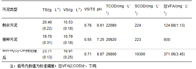 試驗所用剩余污泥取自北京清河污水處理廠,取回后靜置濃縮,置于4 ℃保存.接種污泥取自北京小紅門污水處理廠,為中溫(35℃)厭氧消化出泥.試驗前污泥過18目標準篩以除去大顆粒雜質(zhì).試驗采用MW-H2O2-OH預(yù)處理工藝(Wang et al., 2015;Wang et al., 2009;Xiao et al., 2012;王亞煒,2009;肖慶聰?shù)龋?012;閻鴻,2010),其操作條件如下:加入5 mol · L-1 NaOH溶液,調(diào)節(jié)樣品pH至11,600 W微波功率輻射樣品,升溫至80 ℃,然后按m(H2O2)/m(TS)=0.2加入30%的過氧化氫溶液,繼續(xù)輻射升溫至100℃,結(jié)束.本試驗通過微波-過氧化氫-堿預(yù)處理達到堿性環(huán)境,以抑制產(chǎn)甲烷過程.試驗所用污泥的主要性質(zhì)見表 2.污泥經(jīng)過MW-H2O2-OH預(yù)處理后,添加100 mg · L-1過氧化氫酶(Sigma),混合完全攪拌一定時間以便將殘留過氧化氫分解完全,之后按照I/S(Inoculum to Substrate,揮發(fā)性固體濃度VS/VS)為0.07的比例進行接種污泥接種.之后按照響應(yīng)面法安排進行試驗,試驗中采用的蛋白酶酶活為20萬U · g-1(江蘇銳陽生物科技有限公司).