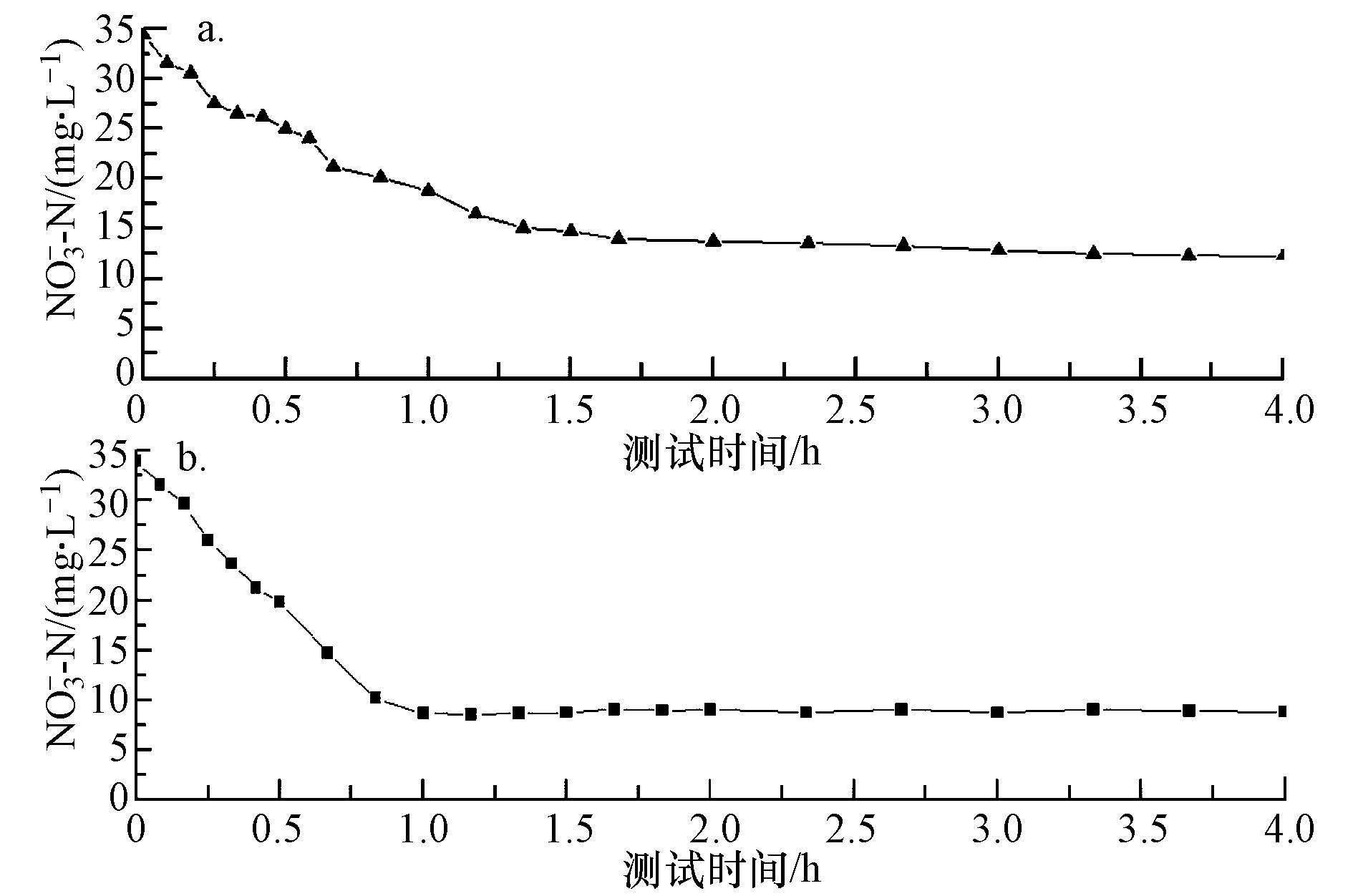 ?圖5 反硝化測試曲線(a.未優(yōu)化組(僅MW-H2O2-OH預(yù)處理)的污泥上清液(徐榮樂,2014);b.優(yōu)化組(MW-H2O2-OH預(yù)處理并去除殘留H2O2+水解酸化)的污泥上清液)
