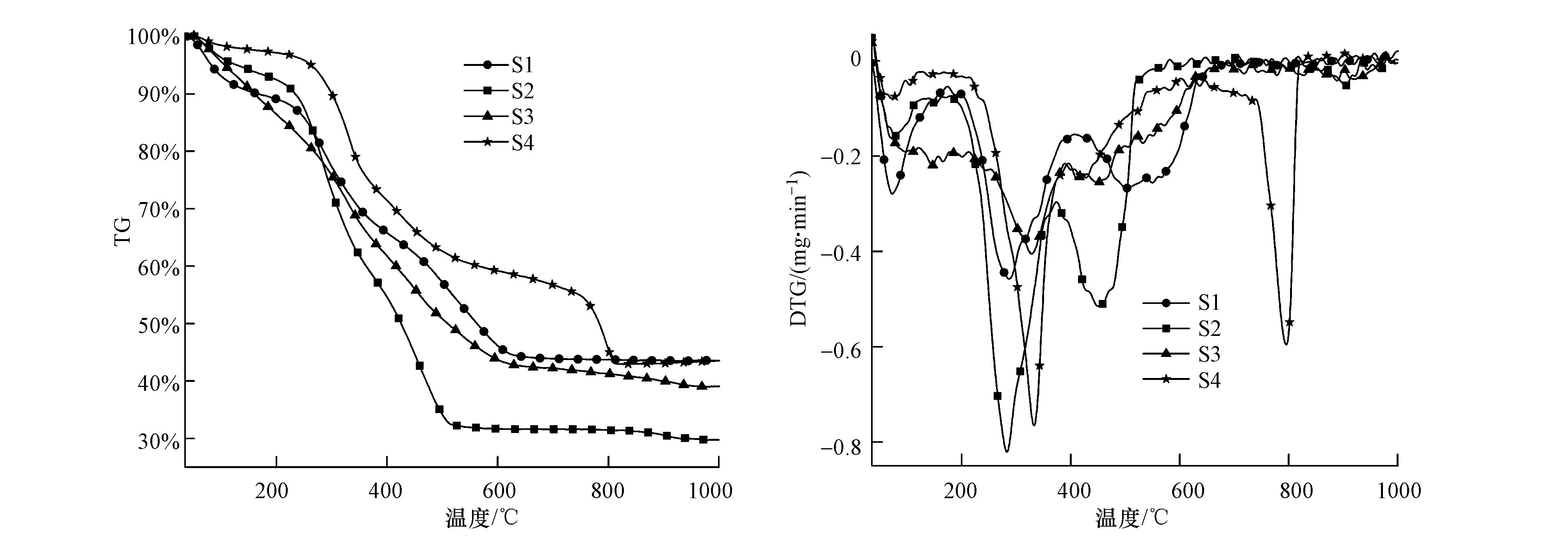 ?圖2 污泥S1分別與S2、S3、S4混合燃燒的TG-DTG曲線