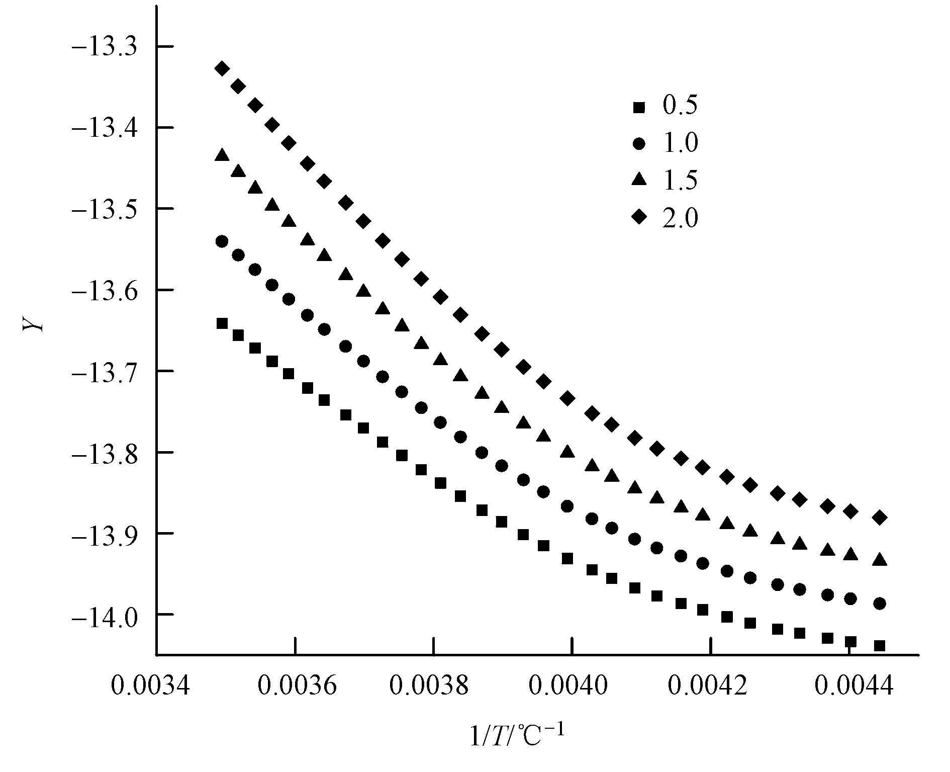 ,對于本實驗中反應溫區及大部分E值而言,的值近似看做常數,令b=- E/R,X= 1/T,Y=
