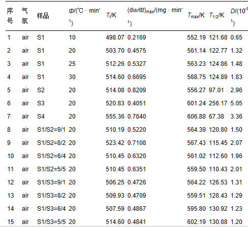 為全面評價試樣的燃燒情況,采用綜合燃燒特性指數S(胡勤海等,2008;沈伯雄等,2000)來表征試樣的整體燃燒特性: