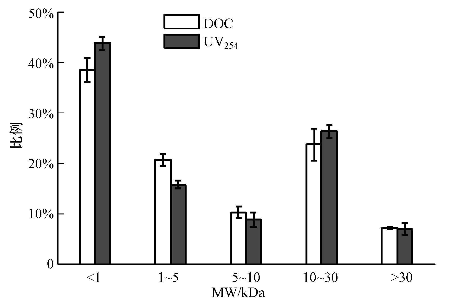 從圖 1可以看出,黃河原水的DOC含量根據(jù)分子量(MW)共分為5組(<1 kDa、1~5 kDa、5~10 kDa、10~30 kDa、>30 kDa),其占總量的百分比依次為38.39%、20.59%、10.23%、23.65%和7.14%,各分子量區(qū)間內(nèi)UV254的分布規(guī)律與DOC相一致,比例分別為43.96%、15.52%、7.76%、25.01%和7.81%.其中,MW <1 kDa組分的比例最高,MW <5 kDa組分的DOC約占總量的60%.分析結(jié)果表明,黃河原水中DOM主要以小分子量存在形式為主.