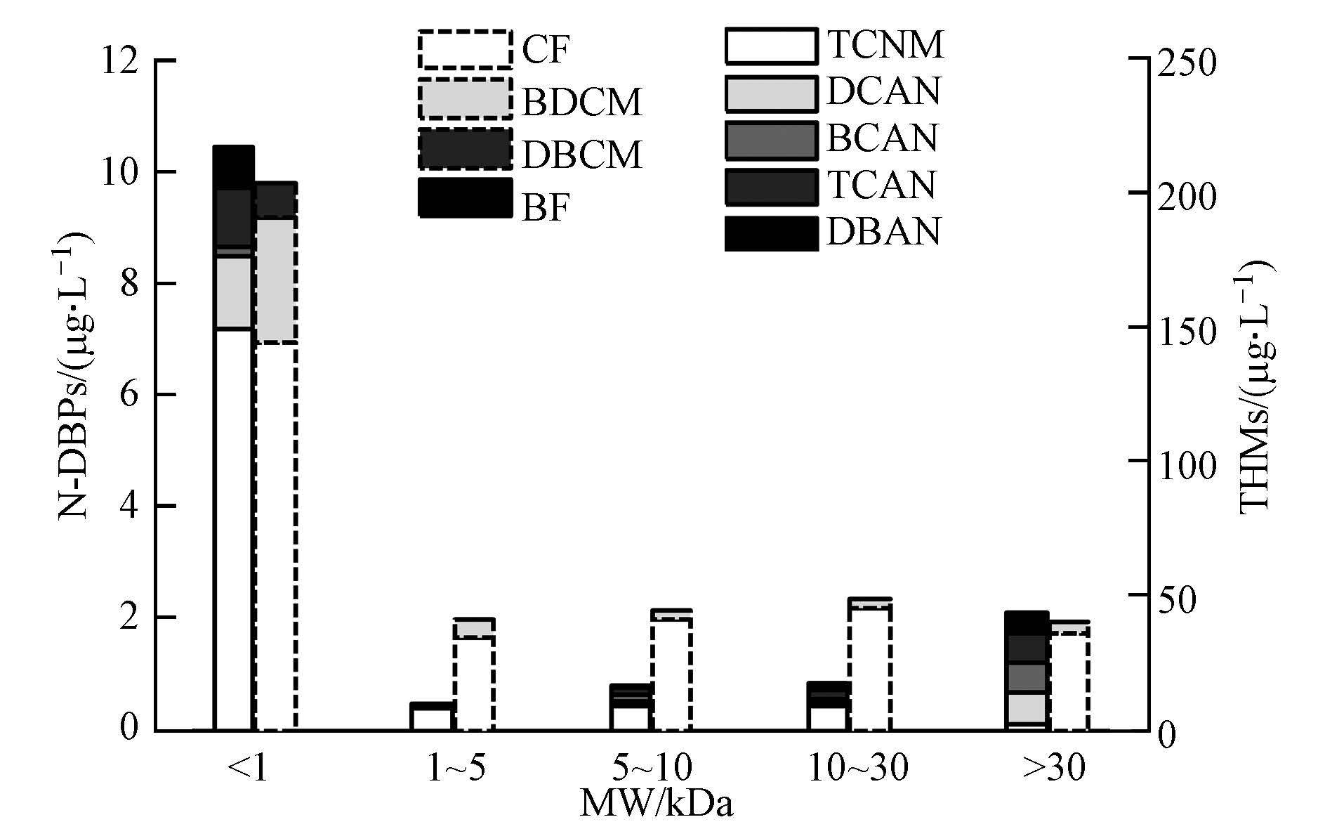 從圖 2可以清楚地看出,黃河原水經(jīng)過(guò)氯化DBPs潛能培養(yǎng)后,可檢測(cè)到4種三鹵甲烷(THMs),分別為氯仿(CF)、二氯一溴甲烷(BDCM)、一氯二溴甲烷(DBCM)和三溴甲烷(BF);還能檢測(cè)到三氯硝基甲烷(TCNM)、二氯乙腈(DCAN)、三氯乙腈(TCAN)、一氯一溴乙腈(BCAN)和二溴乙腈(DBAN)等5種含氮消毒副產(chǎn)物(N-DBPs).黃河原水中各分子區(qū)間有機(jī)物經(jīng)氯化后都有THMs和N-DBPs生成,其中,MW <1 kDa組分具有最高的THMs和N-DBPs生成潛能.這一結(jié)果說(shuō)明MW<1 kDa的組分是生成DBPs的主要前體物,這與Gang等對(duì)不同分子量的前體物對(duì)于三鹵甲烷生成潛能影響的研究結(jié)果相似.一般而言,小分子量的DOM 多含有芳香苯環(huán)和羧基,更易生成THMs;而小分子量DOM中的氨基酸、嘌呤和嘧啶等含氮有機(jī)物(DON)則是HANs的主要前體物.因此,能較好地解釋黃河原水中MW<1 kDa的有機(jī)物組分DBPFP培養(yǎng)后生成的THMs和N-DBPs量最大.根據(jù)相關(guān)研究,在后續(xù)的水處理工藝中采用生物活性炭吸附、光催化氧化、膜技術(shù)等均對(duì)小分子量有機(jī)物的去除有很好的效果.