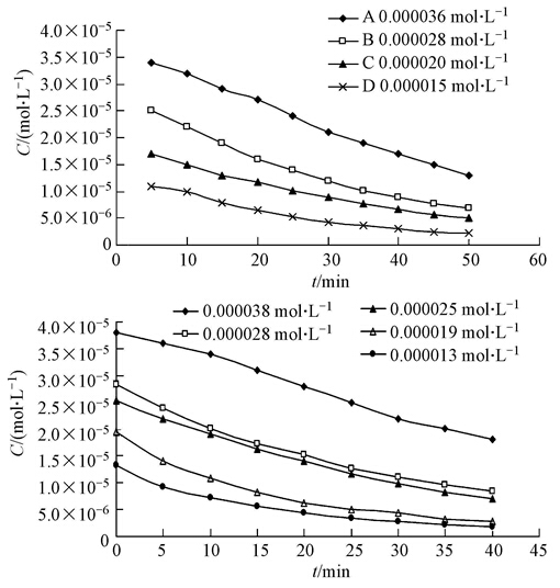 為了進一步了解CuClLa·H2O,CuClLb·H2O催化能力,進行了CuClLa·H2O,CuClLb·H2O米氏常數的測定. 固定催化劑的量,改變染料的起始濃度,采用分光光度計跟蹤降解過程,繪制不同濃度下的脫色率時間曲線,圖 4給出了CuClLa·H2O和CuClLb·H2O在不通濃度下的C-t曲線.