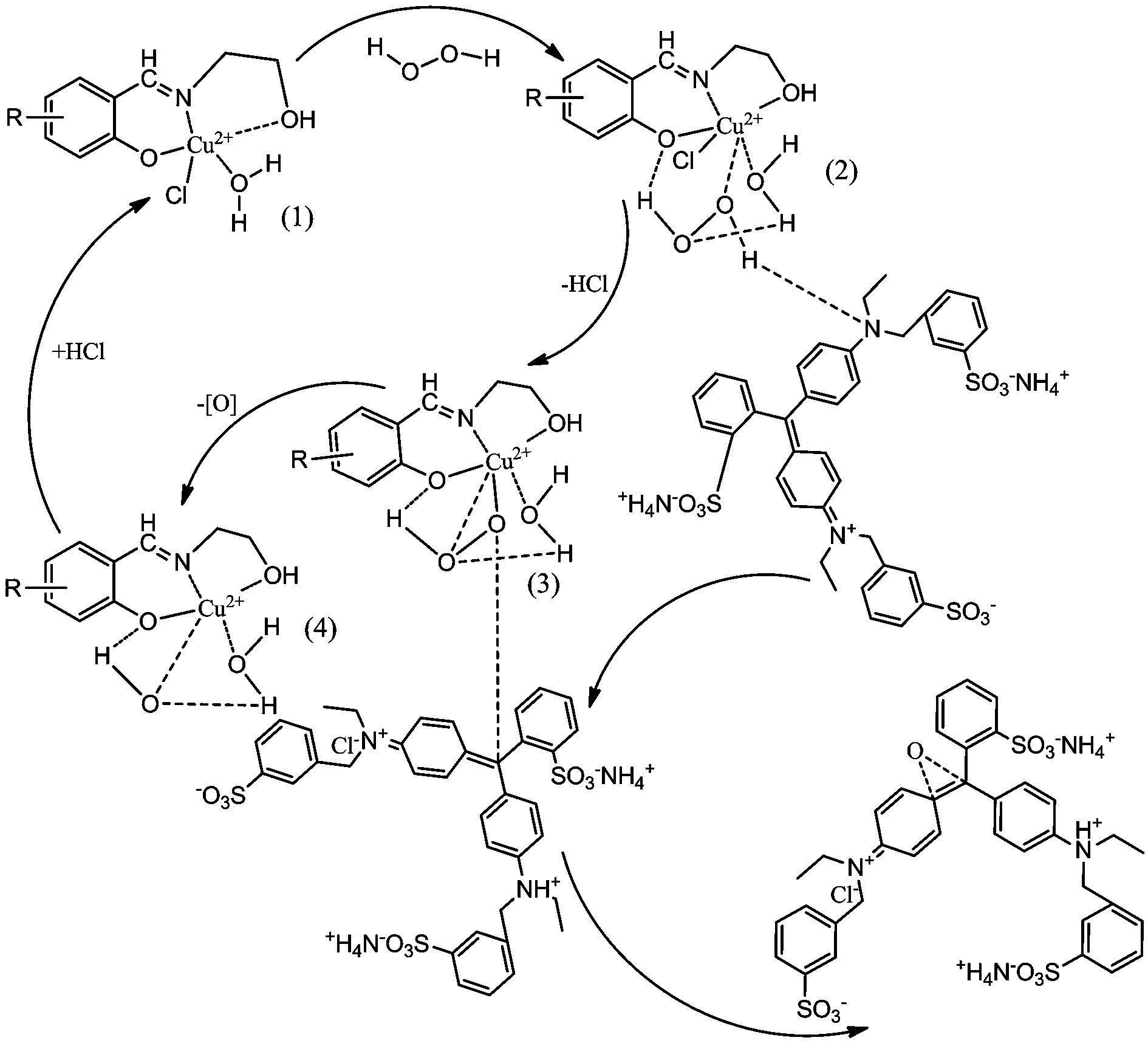 研究發現生物法降解染料的機制主要是有效酶系的作用,諸如漆酶、過氧化物酶等.但是酶法存在產酶量低、受環境影響大、重復利用難導致成本高.利用小分子來模擬酶的活性中心,進行仿生催化得到了發展.近10年來,金屬配合物已成為化學模擬酶領域的熱點研究方向,尤其是Cu配合物.有報道水楊醛胺類席夫堿配合物具有可逆吸附氧分子和催化氧化等性能,席夫堿配合物具有良好的催化性能受到了廣泛關注.