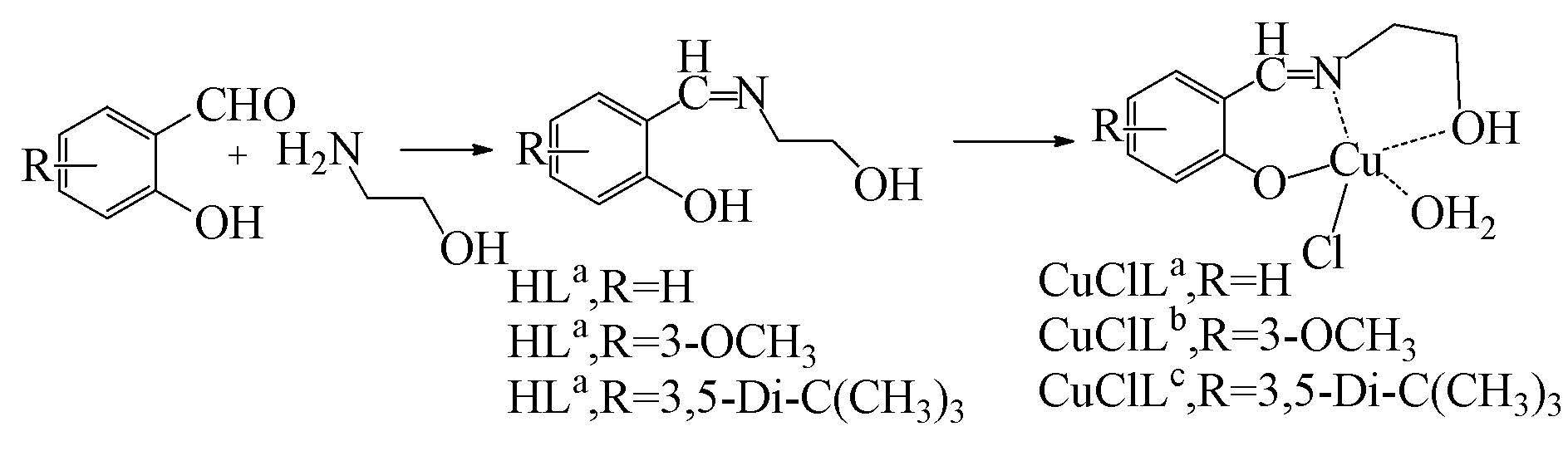 依據文獻,①具有催化染料降解的金屬酶活性中心是金屬及其周圍NO配位環境,配位結構多為三角雙錐或扭變的四面體結構;②設計三齒或四齒配體合成對應的配合物,可以很好的模擬酶的活性.所以課題組為了得到具有降解染料催化活性的仿酶催化劑,實現染料降解的仿生催化,為染料污染物的處理提供理論和實踐參考,設計合成了三齒配體水楊醛縮胺基乙醇(HLa)、鄰香草醛縮胺基乙醇(HLb)和3,5-二叔丁基水楊醛縮胺基乙 醇(HLc)的Cu2+配合物(CuClLa·H2O、CuClLb·H2O、 CuClLc·H2O)(圖 1).對其催化降解三苯基甲烷類染料酸性藍9的性能進行了研究,得到了具有仿酶催化活性的催化劑,有效進行了三苯甲烷類染料的降解,提出了可能的催化機理和降解機理.