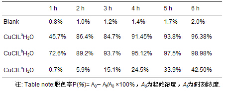 為了模擬酶過程,參照文獻選擇廢水的起始濃度25 mg · L-1,λ=630 nm,pH=7.2,T=37 ℃,以H2O2為氧源,n 配合物 ∶ n染料 ∶ n雙氧水=1 ∶ 10 ∶ 1000,進行配合物催化酸性蘭9的降解實驗,每1 h記錄1次吸光值,計算其脫色率,降解效果見表 2.