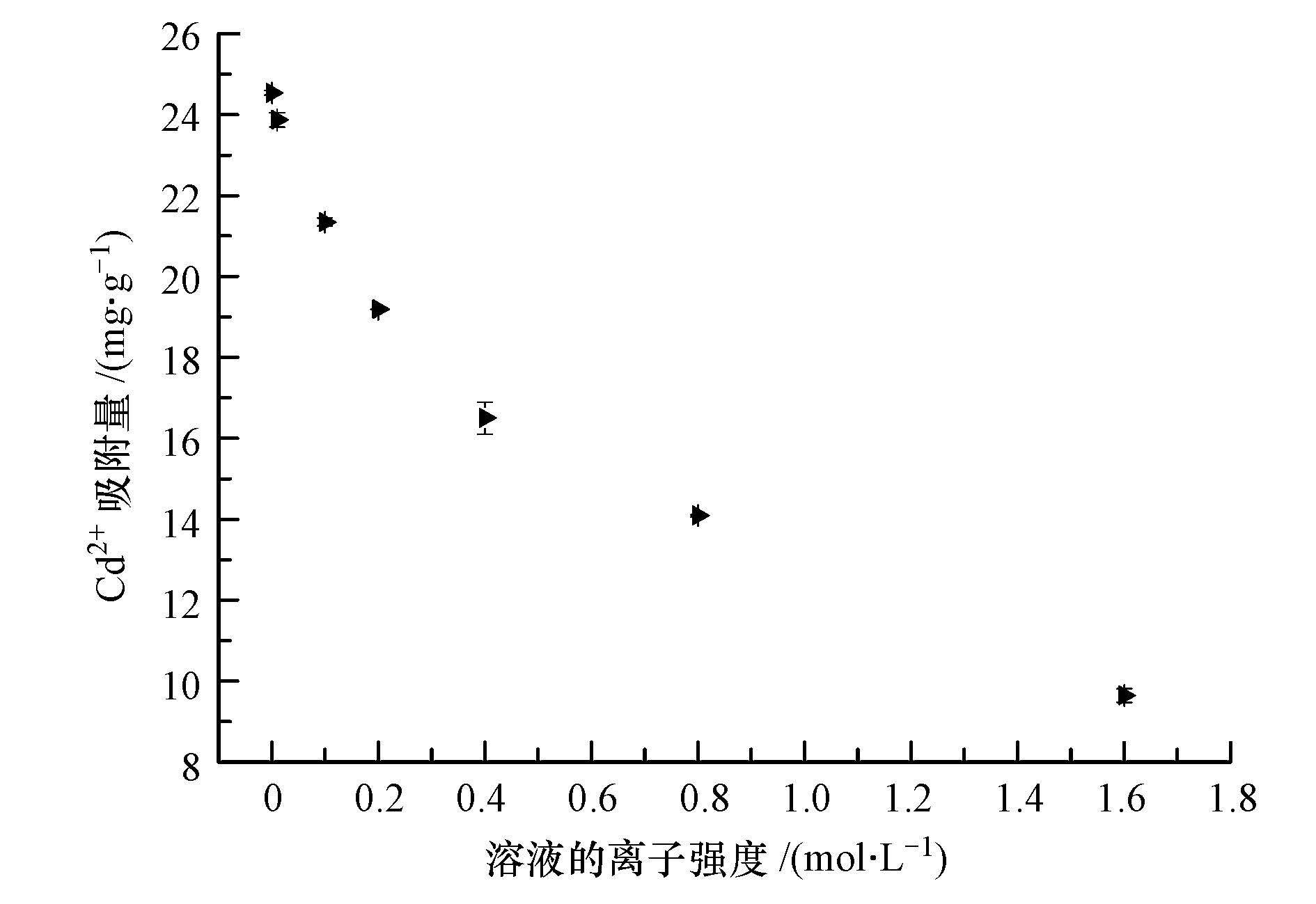 離子強度是影響金屬離子吸附的重要因素,為了了解溶液離子強度對FARs吸附Cd2+的影響,本研究考察了不同濃度的KCl對Cd2+吸附的影響(圖 5).由圖 5可見,FARs對Cd2+的吸附量隨著體系離子強度的增加而顯著減小.其中,當溶液KCl濃度大于0.2 mol · L-1時,FARs對Cd2+的吸附率已經低于50%.因此,隨著溶液離子強度的升高,FARs對Cd2+的吸附量逐漸降低.這可能是因為加入到體系中的K+與Cd2+產生離子交換競爭,增加離子強度導致吸附量減少;此外,FARs與Cd2+之間可能存在較弱的非化學鍵,因此,表現出吸附量隨離子強度的增加而減小.在同一體系中,上述幾種機制可能共存.