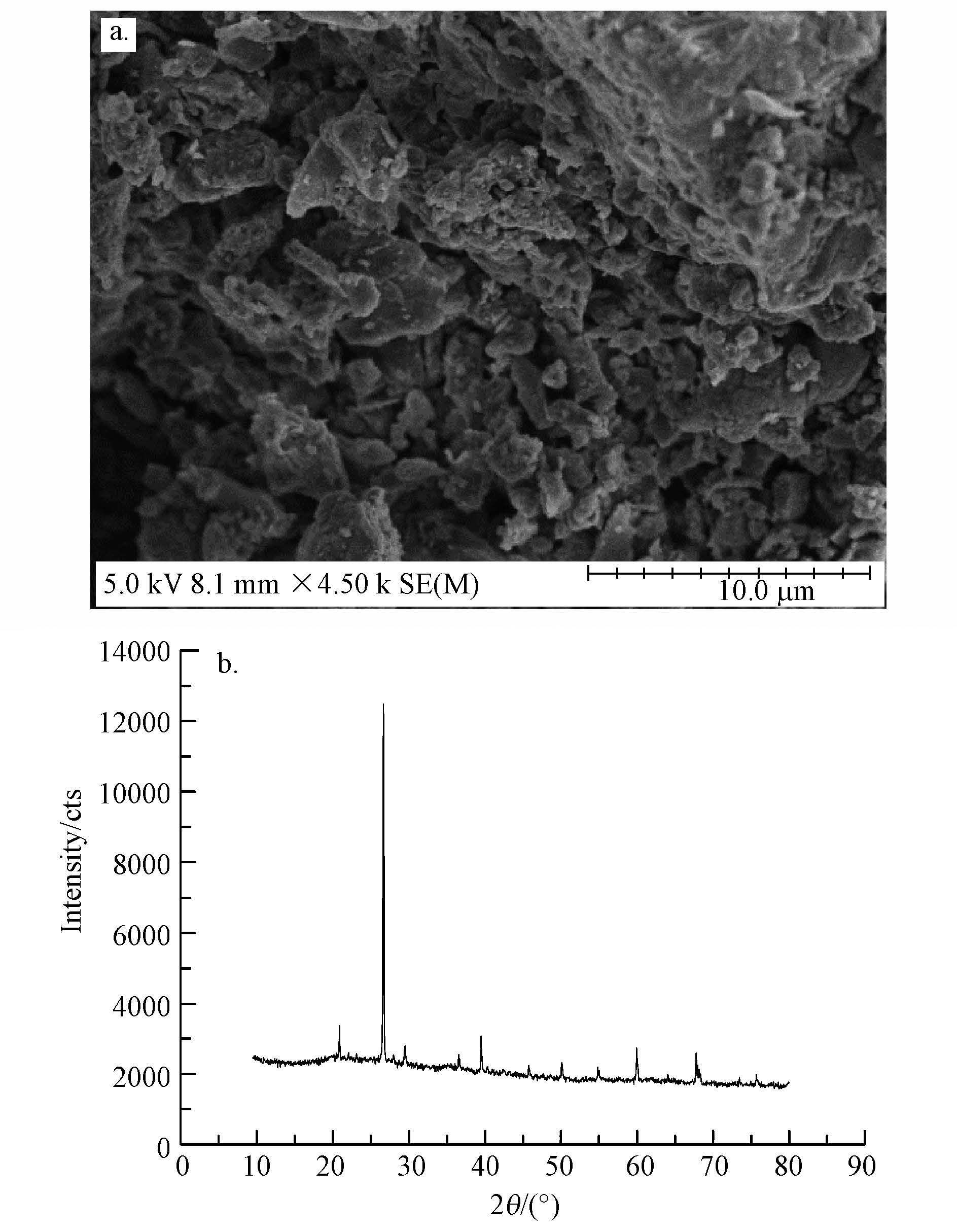FARs取自北京第九水廠(2014年5月),該廠將鋁鹽和鐵鹽作為絮凝劑.樣品采集后,風干并研磨過100目篩備用.FARs中鐵鋁等元素含量根據USEPA Method 3051經酸消解后用ICP(ICP-AES,ULTIA,JY,France)測定,結果見表 1.由表 1可知,FARs具有較高的鐵鋁含量.電鏡掃描(S4800,日立高新技術株式會社,圖 1a)和XRD(X′Pert PRO MOD,荷蘭,圖 1b)結果表明,FARs表面疏松多孔,僅存在SiO2晶體,且不存在明顯的晶體鐵鋁氫氧化物,即無定形態鐵鋁占了主要部分.