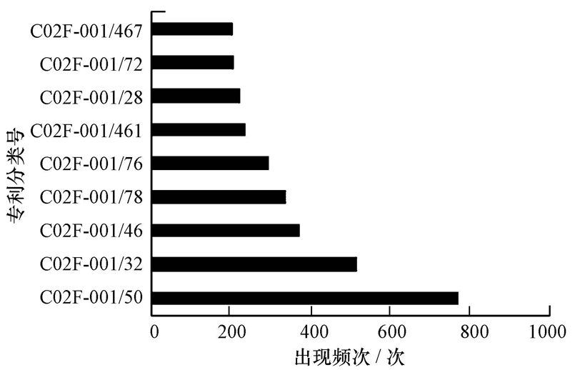 專利申請更多反映技術應用研究情況.專利檢索選取Web of Science中德溫特世界專利索引數據庫,在國際專利分類為C02F*下進行.專利檢索式為:((“drinking water” AND((“disinfect*” AND(“ozone” OR “chlorin*” OR UV))OR “disinfect*”))OR((((“disinfect*” AND(“ozone” OR “chlorin*” OR UV))OR “disinfect*”)AND water)NOT(“waste* water*” OR “atmosphere” OR “circulat* water” OR “deionized water” OR “wastewater” OR “industr*” OR “sewage”))).