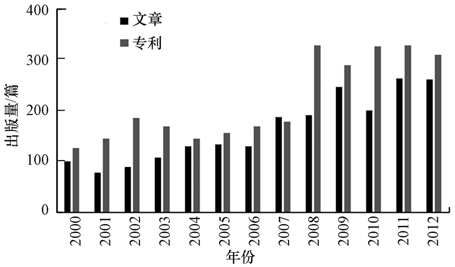 本研究所獲得的數據分別來自文獻檢索和專利檢索,并通過文獻計量分析法對其進行統計分析.文獻和專利檢索的時間跨度均為2000—2012年.