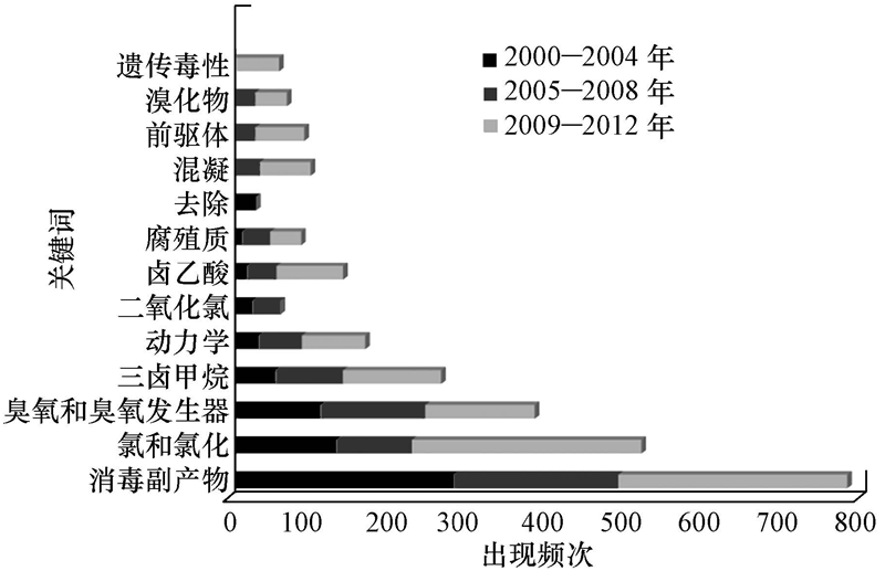 為了了解2000—2012年飲用水消毒領域的主要研究方向及整體變化趨勢,我們對本領域處于前10位的關鍵詞及其出現的頻次進行了統計,并且細分了3個階段(2000—2004年、2005—2008年和2009—2012年)來研究.如圖 2所示,“消毒副產物”、“氯和氯化”、“臭氧和臭氧發生器”、“三鹵甲烷”、“鹵乙酸”和“腐殖質”這幾個關鍵詞在3個階段均排在前10位,表明這13年來飲用水的消毒研究方向主要集中在消毒工藝方法和消毒副產物兩方面.其中“消毒副產物”、“氯和氯化”、和“臭氧和臭氧發生器”這3個關鍵詞在3個時間段的出現頻次始終處于領先地位,進一步確定消毒工藝方法和消毒副產物研究在飲用水消毒領域研究的重要性.