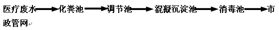 污水由排水系統(tǒng)收集后,進(jìn)入污水處理站的化糞池,厭氧分解其中的糞便及大分子有機(jī)物,然后進(jìn)入調(diào)節(jié)池,進(jìn)行均質(zhì)均量,調(diào)節(jié)池中設(shè)置液位控制器,再經(jīng)液位控制儀傳遞信號,由提升泵送至混凝沉淀池,加藥絮凝沉淀之后,流入消毒池進(jìn)行消毒處理,消毒出水直接排入市政管網(wǎng)。