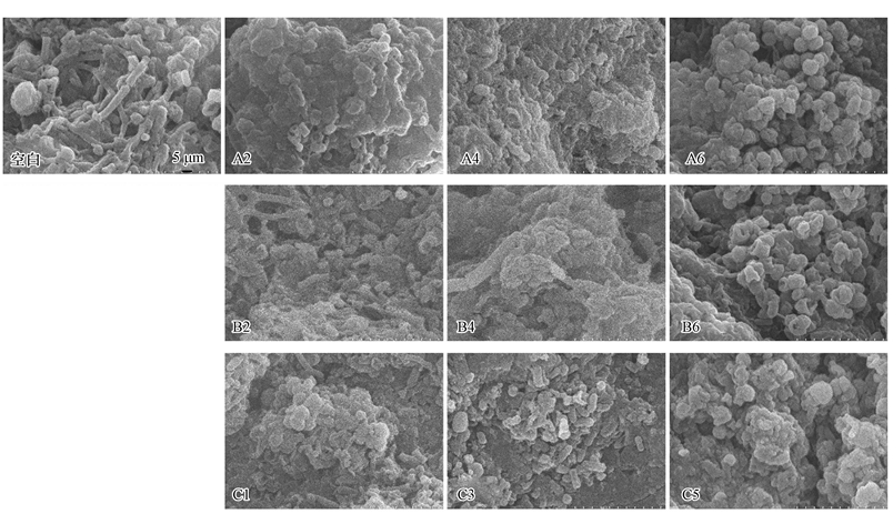 根據(jù)3.1節(jié)中的COD去除率變化選擇具有代表性的濃度組(A組:A2、A4、A6;B組:B2、B4、B6;C組:C1、C3、C5)進行各項指標的測定.圖 2為放大10000倍后的顆粒污泥的掃描電鏡圖.由圖 2可見,空白組厭氧顆粒污泥表面幾乎為8~25 μm長的桿狀菌,伴隨有少量的球菌,污泥表面凹凸不平孔隙交錯,是內(nèi)部微生物能量代謝的重要通道.在高濃度的亞硝氮、硝氮和氨氮(A6、B6和C5)作用下,厭氧顆粒污泥的表面結構都發(fā)生明顯變化,污泥表面的主要細菌由桿狀菌變?yōu)榍驙罹瑤缀醪灰姉U菌.低濃度抑制作用下,污泥表面主要細菌為桿菌和球狀菌,且與空白組相比桿菌比例明顯降低.