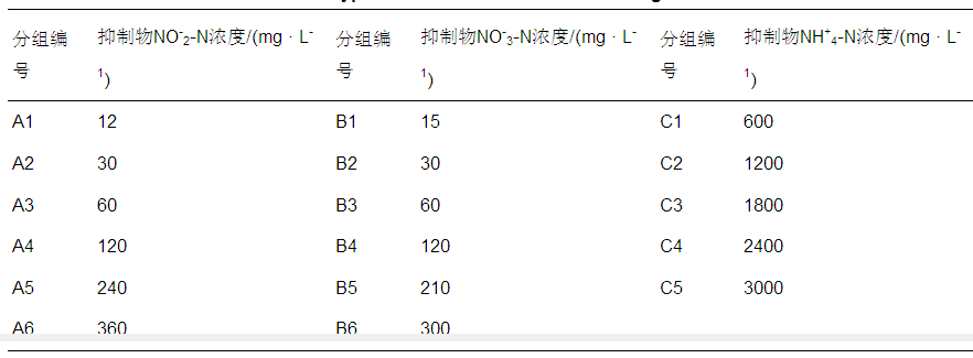 在100 mL血清瓶中加入60 mL配水,pH穩(wěn)定在7.3±0.3,分別向3組血清瓶中加入一定量的NaNO2、NaNO3和NH4Cl貯備液,具體抑制物質(zhì)及濃度情況見表 1.加入40 mL厭氧顆粒污泥,使用高純氮氣吹脫約5 min去除血清瓶中的溶解氧,密封后置于35 ℃恒溫水浴振蕩器中進行培養(yǎng),每個濃度梯度設3個平行.