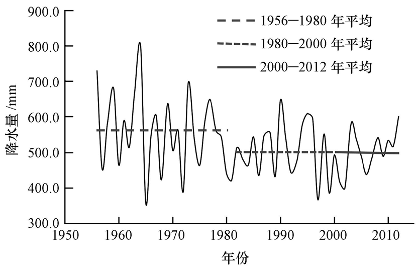 降水量的持續(xù)減少、山前水庫帶對(duì)水資源的截留以及平原區(qū)水資源開發(fā)利用率的增加導(dǎo)致河道內(nèi)徑流量減少,是海河流域河流非常規(guī)水源補(bǔ)給形成的一個(gè)主要原因.海河流域地處季風(fēng)氣候區(qū)的邊緣,降水量持續(xù)減少導(dǎo)致河流徑流量減少.分析1956—2012年海河流域年降水量情況(圖 4),1956—1980年海河流域平均降水量為559 mm,1980—2000年全流域平均降水量大幅度降低至504 mm,至2012年變化不大,平均降水量為502 mm.最近10年的降水量比20世紀(jì)五六十年代的降水量減少了近100 mm.海河流域水資源量稟賦不足,降水量的持續(xù)減少加劇了水資源的匱乏,使得河流非常規(guī)水源補(bǔ)給的特性更為突出.