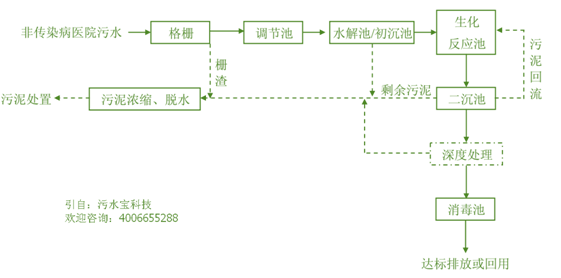 康復醫院污水產生環節主要來自病房,診療室,化驗室,手術室,洗衣房及行政管理部門,食堂,宿舍等排放的污水,主要污染物為有機污染物,懸浮物,病原微生物及病毒等。污水若不經過處理直接排放,則會嚴重影響周圍環境,破壞接納水體水質,對人們的正常生活造成影響。