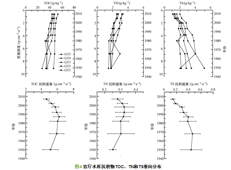 沉積物中碳氮硫的沉積通量變化有所差異,其中TOC沉積通量在1980年左右呈現明顯轉折變化,由快速增加轉為快速減少;TN的沉積通量自水庫建成后至2000年緩慢增加,然后逐步減少;而TS沉積通量與沉積柱中TS含量變化趨勢相同,隨年代逐漸減少.官廳水庫中TOC和TN沉積通量與有機質沉積通量變化趨勢相似,表明TOC和TN的垂向分布特征可能與有機質的沉積降解過程有關.自水庫運行以后流域內輸入的有機質逐步增加,1980年以后流域內采取控制水土流失措施后,有機質沉積速率降低帶來TOC大幅減少,而TN減小幅度相對較緩,說明水體中氨氮和硝酸鹽的遷移轉化也是沉積物中TN重要來源,這也與1980年后水庫水體出現富營養化的觀測結果相吻合.TS沉積通量隨深度增加而增加的趨勢,也表明官廳水庫沉積物中硫元素主要來自于硫酸鹽成巖過程.