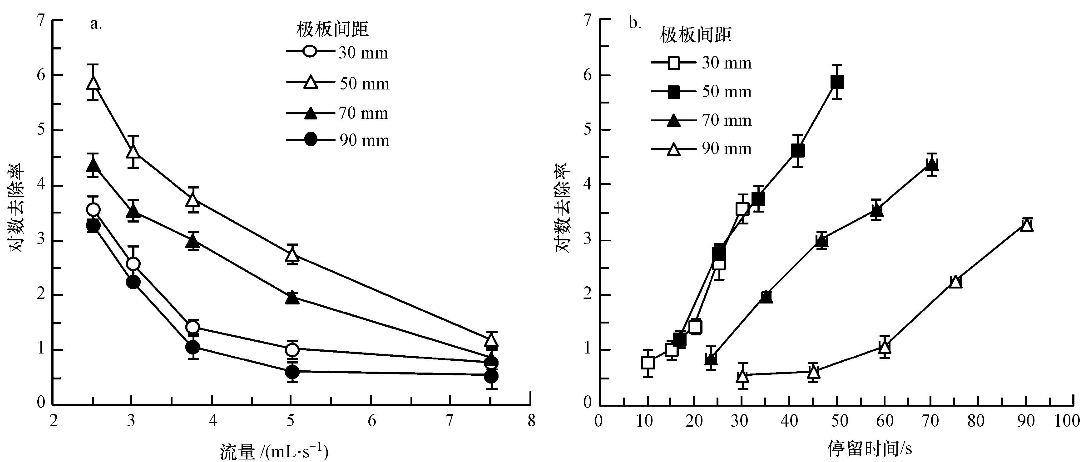 圖3 電極板間距對(duì)普通大腸桿菌對(duì)數(shù)去除率的影響(a.不同流量下的電化學(xué)滅活效果;b.不同停留時(shí)間下的電化學(xué)滅活效果)