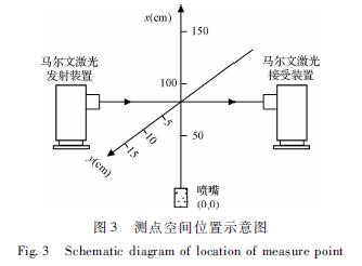 實驗所選用的噴嘴為煤礦井下最常用的螺旋型壓力噴嘴,霧流形狀為實心圓錐。第1組實驗為霧滴粒徑的空間分布實驗,選擇孔徑為1.5mm的噴嘴,對噴霧壓力為8MPa下的霧化粒徑進行測定。通過移動激光粒度分析儀改變激光測試線與噴嘴的水平和垂直距離,測定霧場不同位置的霧滴粒徑分布情況。本組實驗根據(jù)噴嘴現(xiàn)場應用的位置情況,在噴嘴軸線方向選取5個位置,即離噴嘴50?75?100?125?150cm,并分別用空間坐標表示為(50,0)?(75,0)?(100,0)?(125,0)?(150,0);在離噴嘴100cm的斷面上沿軸線垂直方面選擇4個位置,即距離軸線0?5?10?15cm,空間坐標表示為(100,0)?(100,5)?(100,15)?(100,20)。各測點空間位置布置如圖3所示。第2組實驗為噴霧壓力的影響實驗,對5種(2?4?6?8?10MPa)供水壓力下的霧化錐角?霧流射程以及霧化粒度進行測定,實驗所選噴嘴同第1組實驗。第3組實驗為噴嘴直徑的影響實驗,采用馬爾文實時高速噴霧粒度分析儀和高速攝像儀,對5種不同直徑的噴嘴(1.0?1.2?1.5?1.8和2.0mm)在噴霧壓力為8MPa下的霧化錐角?霧流射程以及霧化粒度進行測定。同時,也對不同直徑噴嘴在相同耗水量(5.6L/min)下的噴霧壓力及其霧化特性參數(shù)進行了測定。具體參見污水技術資料更多相關技術文檔。