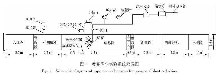 設計了可仿真煤礦井下采掘工作面通風?噴霧等工況的噴霧降塵系統(tǒng),如圖1所示。該系統(tǒng)主要由巷道模型?馬爾文實時高速噴霧粒度分析儀?高速攝像儀?BPZ75/12型高壓水泵 ?水箱?畢托管?TSI9565-P風速儀以及相關的閥門?管道等組成。巷道模型由入口段?整流段?測量段?噴霧段?軸流風機及出口段等組成。為便于實驗觀測和噴霧粒徑測量,巷道模型噴霧段采用板厚為1cm的有機玻璃制作,其他部分均由鋼板加工制作而成。巷道模型總長度約20m,斷面尺寸為0.6m×0.6m,各分段長度見圖1。