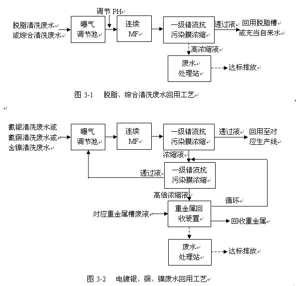 對(duì)圖3-1說明,脫脂清洗廢水與綜合清洗廢水分別收集單獨(dú)回收利用,脫脂廢水中主要含有少量脫脂劑及極少量的油脂,顯堿性,水中懸浮及膠體物很少。廢水經(jīng)過PH調(diào)節(jié)后,進(jìn)入連續(xù)微孔過濾裝置,攔截較小懸浮物、膠體、細(xì)菌微生物及二次污染帶入的雜質(zhì)等,連續(xù) MF具有自動(dòng)運(yùn)行、沖洗功能;MF透過液進(jìn)入膜濃縮系統(tǒng),主要是脫除廢水水中鹽份,該膜元件是根據(jù)電鍍廢水的特性,采用連續(xù)錯(cuò)流抗污染技術(shù),脫脂部分透過液回用至電鍍線脫脂槽;綜合廢水透過液可充當(dāng)自來水或進(jìn)一步制成高純水使用,兩者濃縮廢水可直接去廢水站綜合處理系統(tǒng)進(jìn)行處理。