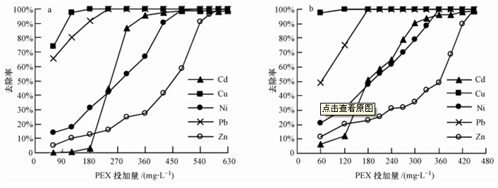 圖 3 PEX去除混合重金屬(a.各為25 mg · L-1;b.各為0.25 mmol · L-1)