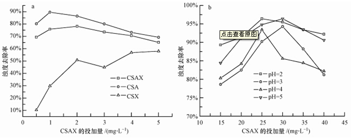 圖 4 CSAX 的除濁性能(a.與CSX、CSA的對比;b.不同pH值下的性能)